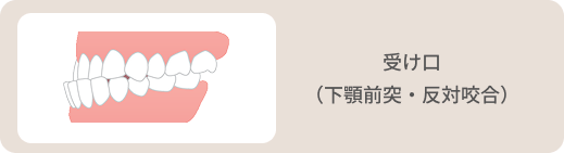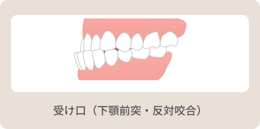 受け口は下の歯(下顎の歯全体)が上の歯に隠れ、噛み合わせが反対の状態になっていることを言います。嚙み合わせが反対になっていることから「反対咬合」とも言います。